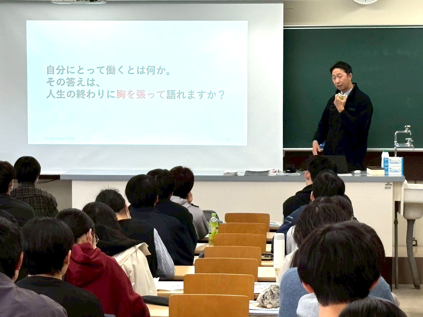 続いて「私たちは何のためにはたらくのか?」という問いを立てて、学生と一緒に考える時間となりました。