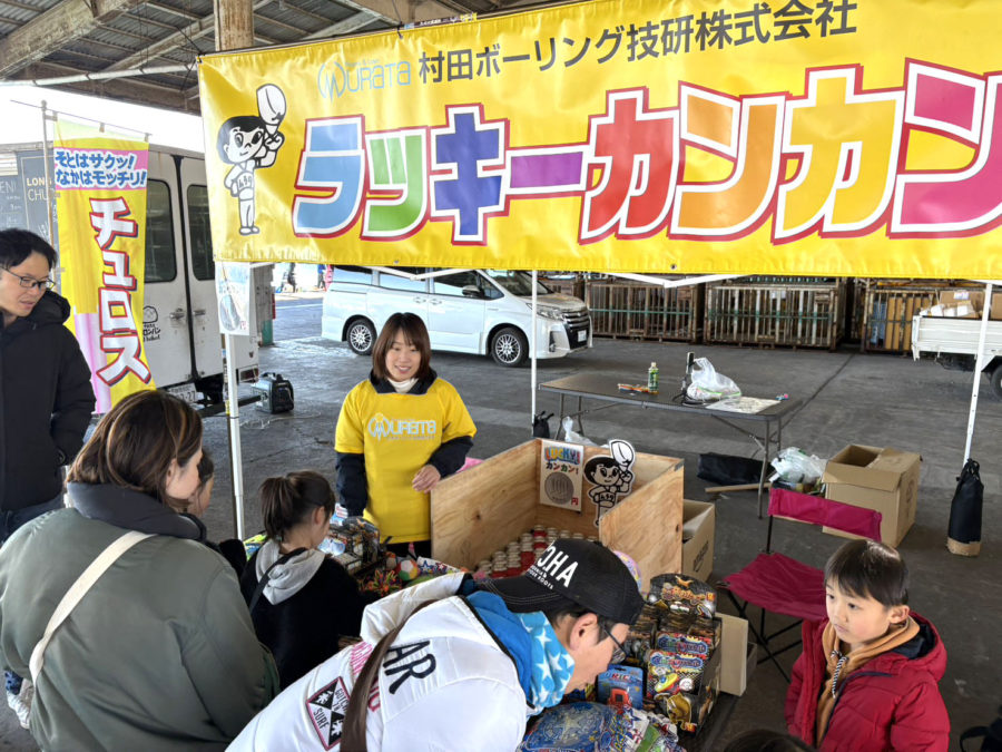 投げられたお菓子やお餅を袋いっぱいに手にした子供たち。その後、ムラタのラッキーカンカンに! 今回、子どもたち100人にラッキーカンカン1回無料としたこともあり、10時からお昼すぎまでの間、行列が途切れることがなく大人気となりました。子どもたちに楽しいひとときを。小さな社会貢献活動、無事に終了しました。