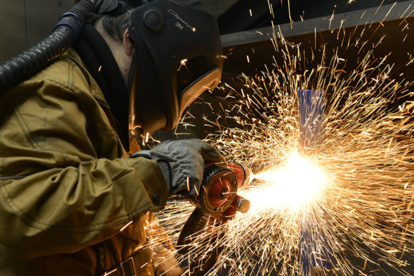 社員によるクイズ大会で場が和んだあと、生徒さんたちは工場見学のグループと、ムラタ坊やのキーフォルダー作りの2つに分かれました。工場見学では迫力のある溶射の様子にみんなびっくりした様子!