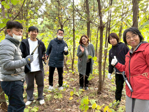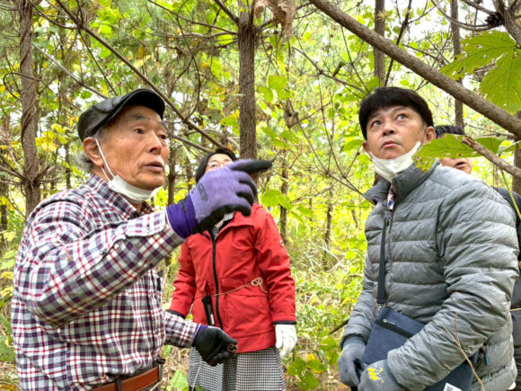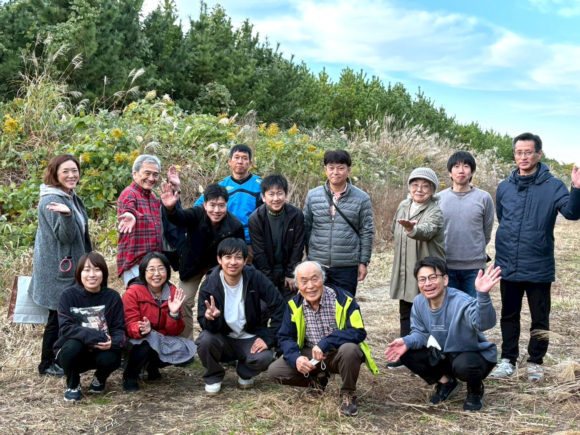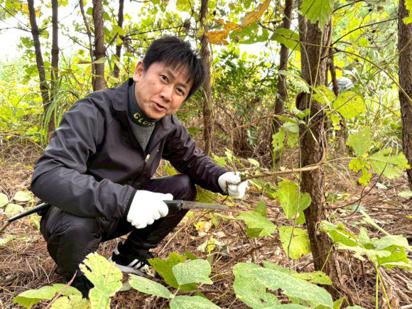 東日本大震災による津波で流された防風林を復興するために活動する田中秀穂さんとともに、クロマツに絡むツルを取る作業をしました。