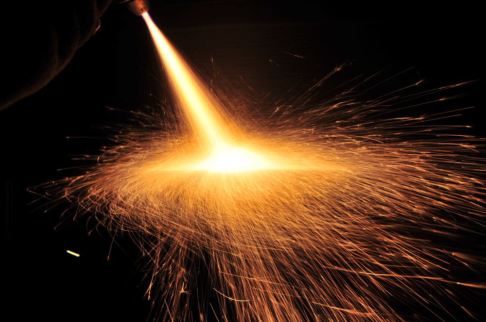 写真:ワイヤー溶射(材料となるワイヤーを瞬間に溶かし、高速で母材に吹き付けている状態)