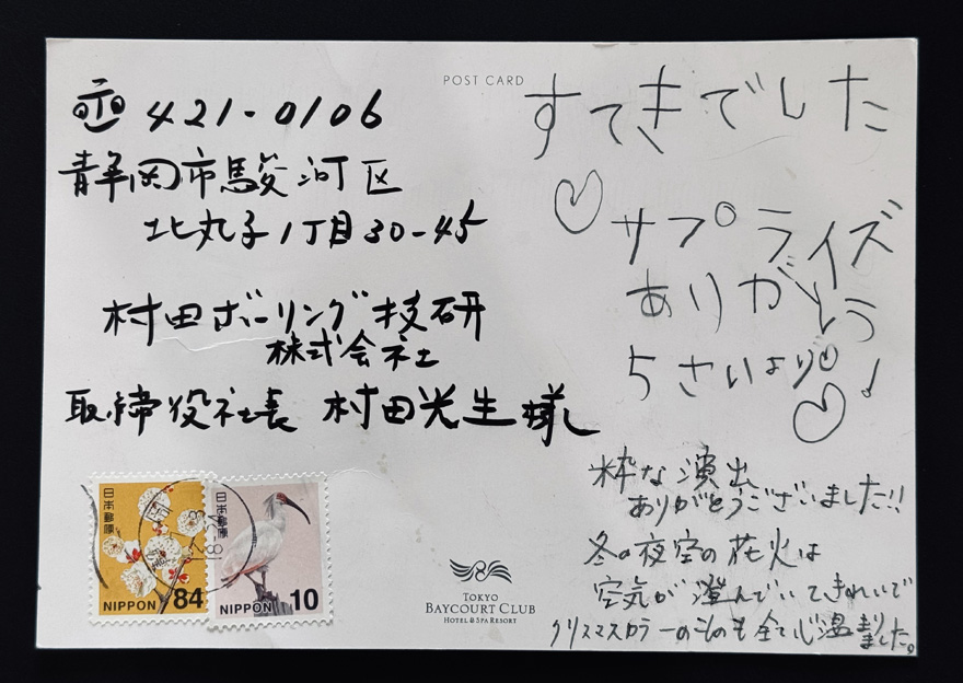都内にある会員制専用の絵ハガキだったことから、冬休みにご家族で宿泊されたホテルから、わざわざ送ってくださったものだと分かりました。