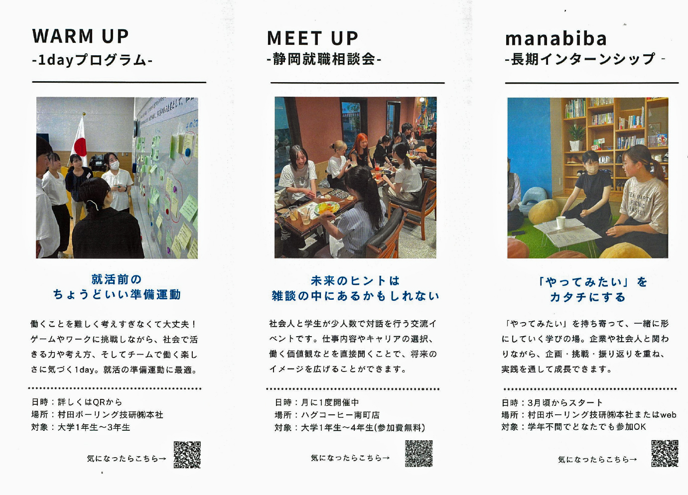 最近のインターンや説明会は「採用に直結させること」が主な目的となりがちですが、私たちの開催する3つのプログラムは、「自社への採用」を目的としていません。 学生の皆さんが、自分自身で納得のいく就職先を見つけられるよう、本気で応援するための場です。