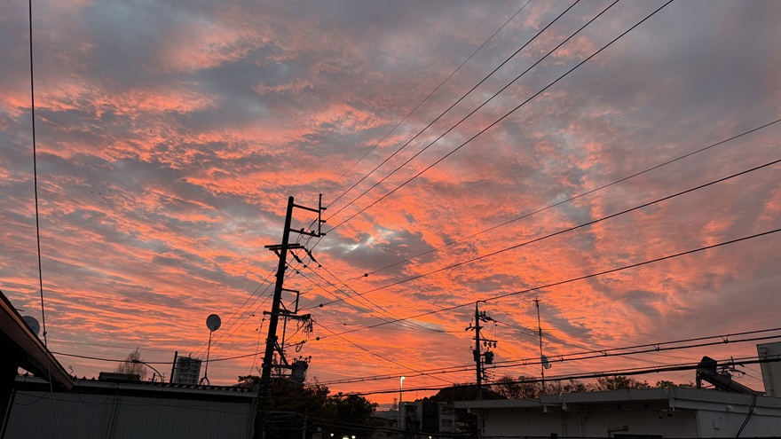一昨日、朝5時半ごろにふと外を覗くと、窓の外には写真のような素晴らしい朝焼けが広がっていました。