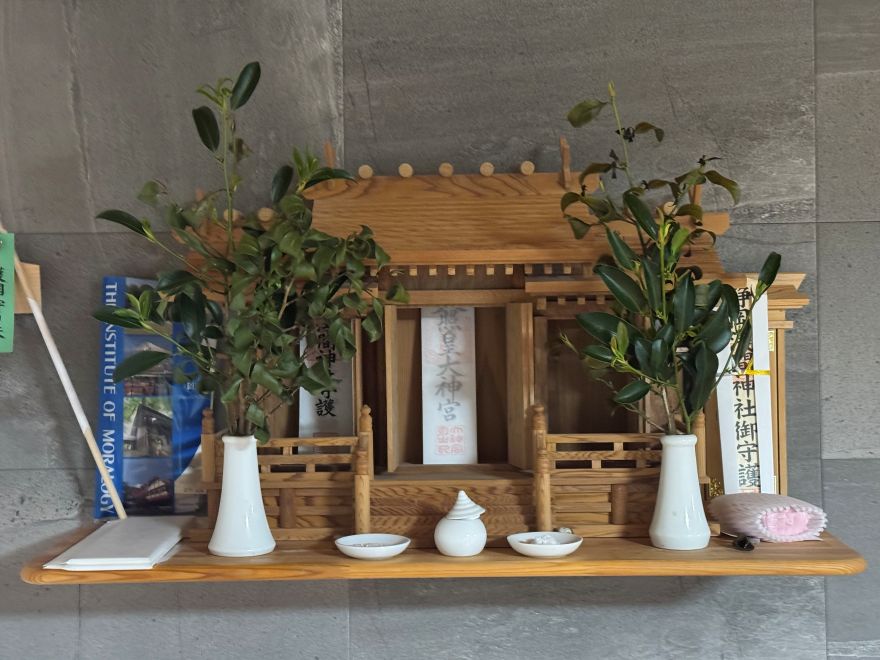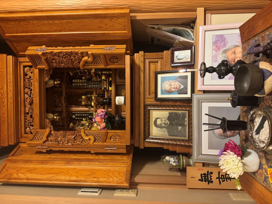 仏壇用のお茶とコーヒーを淹れ、神棚と仏壇へ手を合わせます。